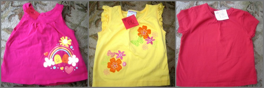 We snatched up a few summer shirts also in pristine shape! Who are these 24 month olds who don’t ruin their clothes by eating?! I’m sure that Grace will be the last stop for these threads. Unless she has a sister that I don’t mind outfitting with stained shirts. Oy.
